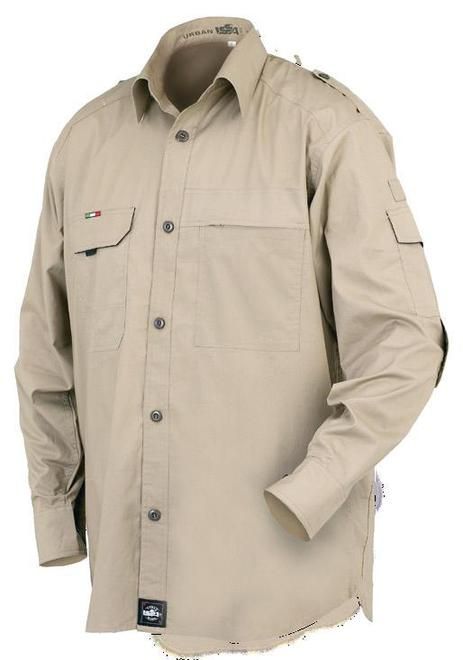 Camisa en tejido Stretch algodón 120gr./m2. La prenda especialmente confortable gracias a las características propias del algodón y a la elasticidad del tejido que facilita el movimiento. Color: beige Tallas: S-M-L-XL-XXL