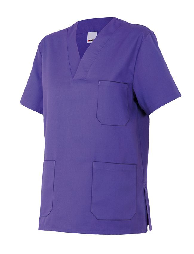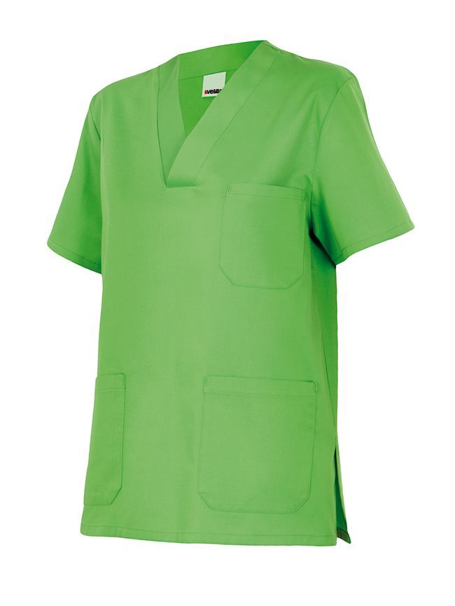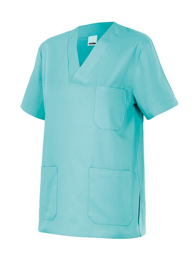 CUELLO PICO, MANGA CORTA Y TRES BOLSILLOS. ABERTURAS EN LOS LATERALES PARA MAYOR COMODIDAD.