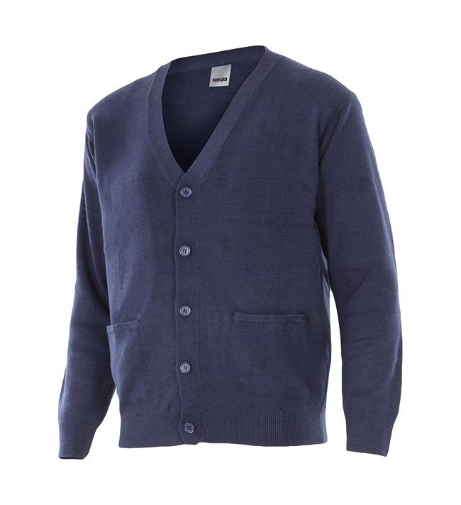 100% acrílico Tejido de punto, 325 grs/m2 Cierre frontal con botones Dos bolsillos frontales Etiqueta gris bordada Caja 20 unds.: embolsado individual Tallas adulto: XS - S - M - L - XL Colores: Granate y azul marino.