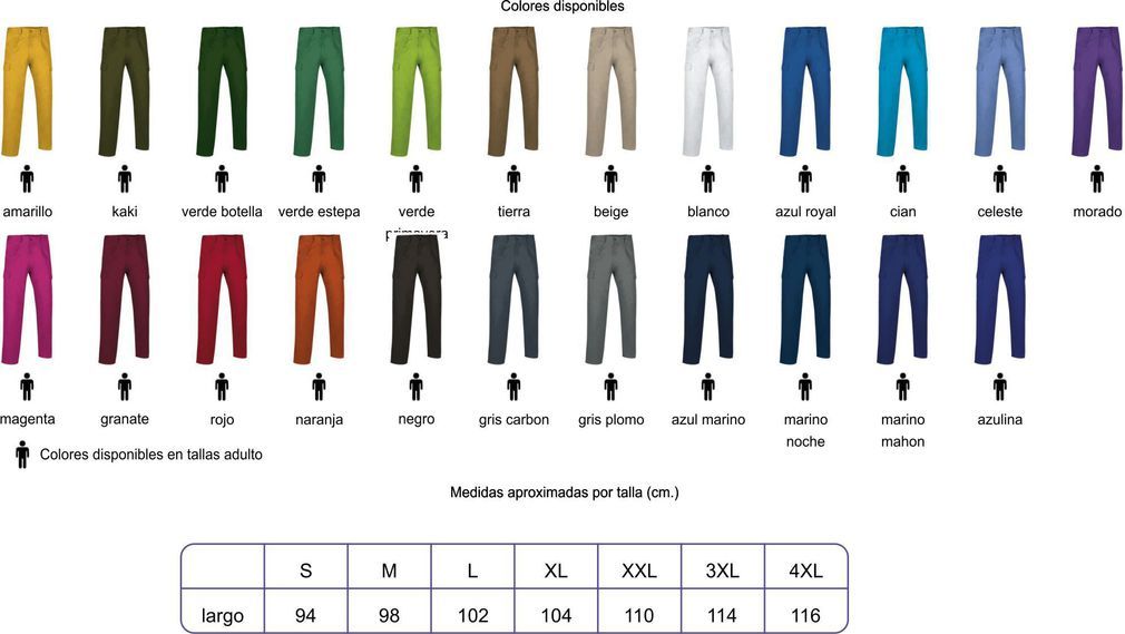 65% poliéster, 35% algodón Tejido sarga 210 grs/m2 2 bolsillos en cintura 2 bolsillos laterales 1 bolsillo trasero Cierre con cremallera y botón Etiqueta blanca estampada Caja 20 unidades Embolsado individual Tallas adulto: S - M - L - XL - XXL Tallas especiales: 3XL - 4XL