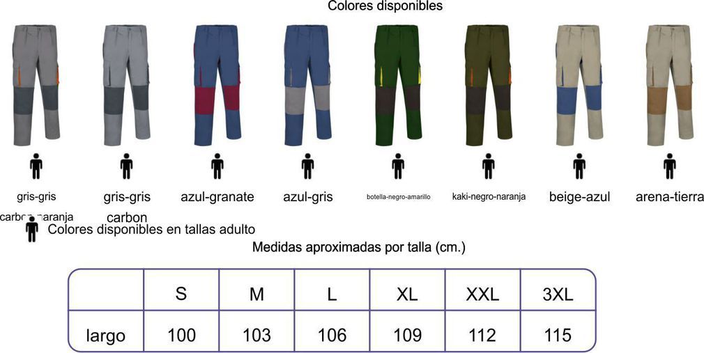 65% poliéster, 35% algodón Tejido sarga 220 grs/m2 2 bolsillos en cintura 2 bolsillos laterales con fuelle 1 bolsillo trasero Rodilleras con acceso Cierre con cremallera y botón Etiqueta blanca estampada Caja 20 unidades Embolsado individual Tallas adulto: S - M - L - XL - XXL Talla especial: 3XL